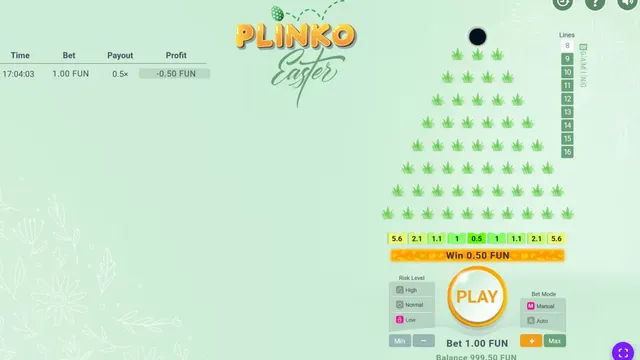 Discover Easter Plinko at 1Win by BGaming — a colorful Plinko variant with 99% RTP, adjustable risk levels from low to high, 8-16 rows
