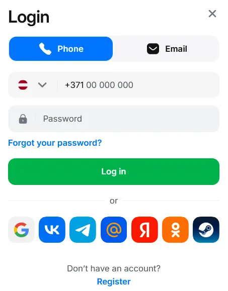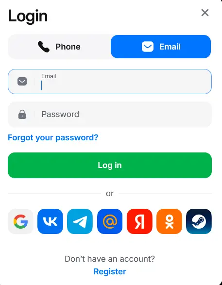 Social media account — click the icon of your preferred platform. 1Win supports Google, Telegram, VK, Yandex, Mail.ru, Odnoklassniki, Twitter, and Steam.