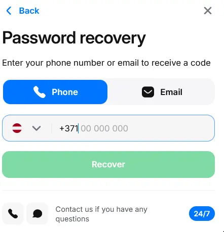 Forgotten password or lost credentials Follow the password recovery steps outlined in the section above. If you have lost access to your registered email and phone, contact the 24/7 live chat support with your identity documents ready.