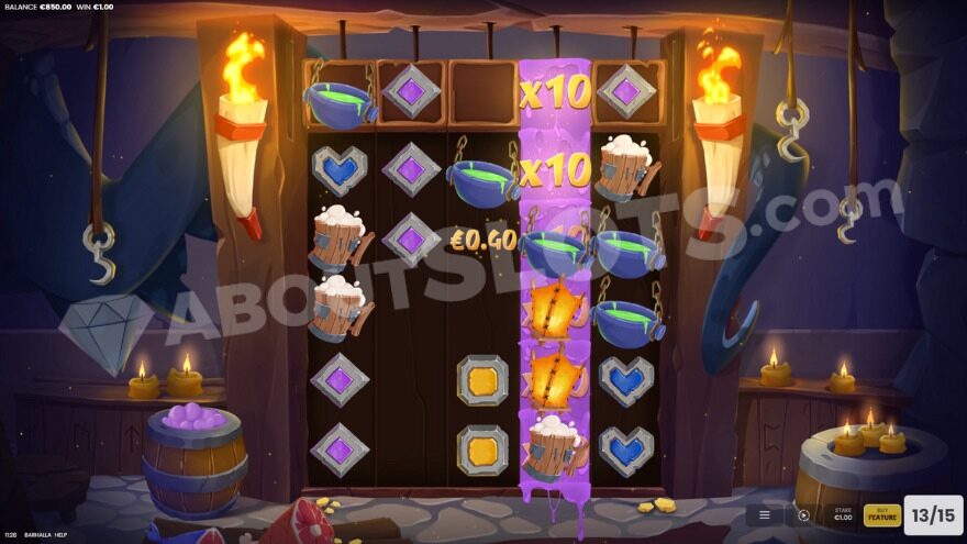 The Wild symbol, represented by a dwarf drinking ale, only appears in the Wild Zone – the top row of the reels. If a Wild symbol is part of a winning combination, the dwarf spills his drink onto the reel below, adding a 10x multiplier to each symbol position on that reel. If a multiplier is already present on the reel, 10x is added to its value, up to a maximum of 100x. This multiplier is applied to all wins it contributes to.