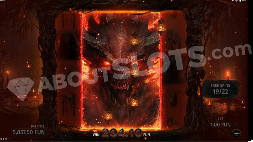 Landing 3, 4, or 5 Scatter symbols (represented by a pentagram) will trigger the Dark Ritual Bonus, awarding 10, 12, or 14 free spins respectively. During this bonus round, a pentagram overlay appears on the reels, marking a position on each reel. If a Wild symbol lands on a pentagram position, it awards an additional 2 free spins and remains sticky for the duration of the bonus. Filling all 5 pentagram positions with Wild symbols summons Lucifer, transforming reels 2, 3, and 4 into fully Wild reels for the remainder of the bonus. Enjoy playing Darkness slot for money at 1win.