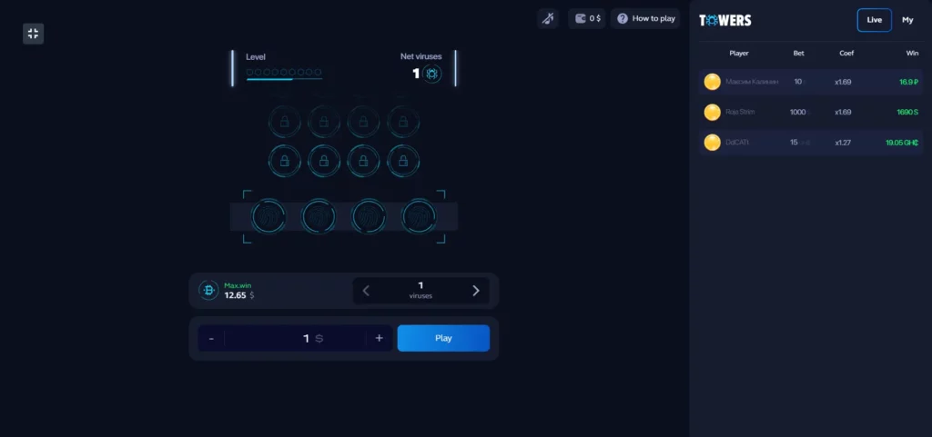 TOWERS is a tower-climbing game with a strategic element, where you ascend a 9-level tower. On each level, you pick one cell from a grid. Some cells hide a virus — hit one and the round ends with your stake lost. Pick a safe cell and you move up, with your multiplier growing as you go.