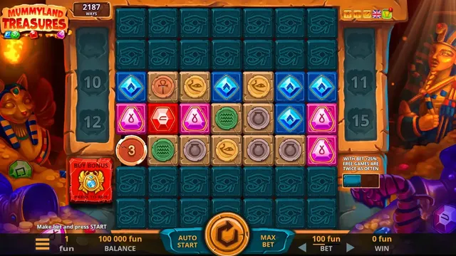 Play Mummyland Treasures at 1Win — Belatra's Egyptian slot with an expanding 7x7 grid, 823,543 ways to win, free spins, and 25,000x max win.
